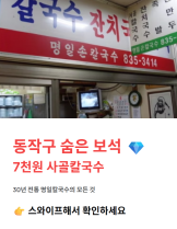 30년 넘게 한자리를 지키는 데는 다 이유가 있더라고요. 맛도 맛이지만, 주인분들의 정성이 느껴지는 곳이에요. 지하상가라는 위치적 한계에도 불구하고 단골들이 꾸준히 찾는 이유를 확실히 알겠어요. 동작구에서 진한 사골 육수의 칼국수가 먹고 싶다면 명일칼국수, 강력 추천해요!