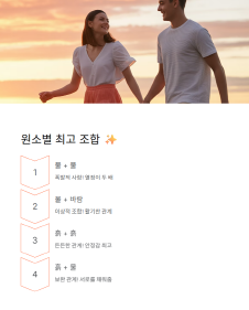 🔥 불 (양·사자·사수) - 열정적이고 적극적인 연애. 불+불=폭발적 사랑, 불+바람=이상적 조합