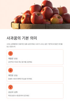 사과꿈은 대부분 좋은 의미를 담고 있어요! 특히 빨갛고 탐스러운 사과, 사과를 따거나 먹거나 받는 꿈은 재물운과 애정운 상승의 징조랍니다. 사과나무가 풍성한 꿈은 가문의 번영을 의미하고요.