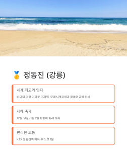 매년 정동진에서 본 일출이 정말 잊을 수 없어요. 추운 날씨였지만 떠오르는 해를 보는 순간 모든 추위가 사라지더라구요!